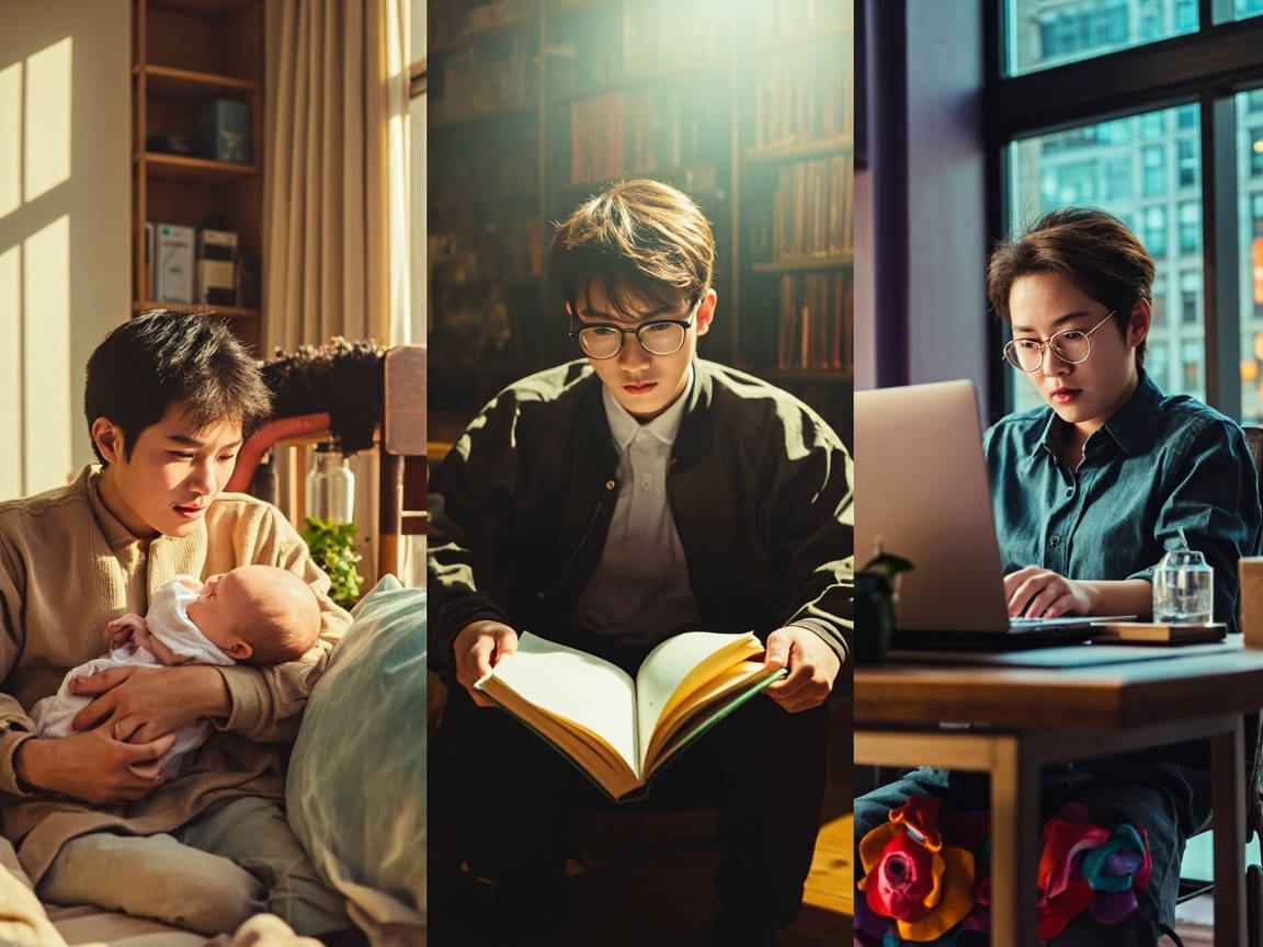 凌晨五点半,李萌萌被婴儿的哭声拽出梦乡。她熟练地冲好奶粉,看着怀里皱巴巴的小脸,突然想起十年前在宿舍偷吃泡面追选秀的自己。如今手机相册里一半是宝宝的成长记录,另一半藏着加密的追星相册——上周刚抢的演唱会门票还夹在《育儿百科》里,同事眼里的“新手妈妈”,其实昨晚还在超话打榜到两点。 同一座城市的另一端,张弛正对着电脑屏幕敲代码。实验室的师兄们讨论着论文影响因子时,他偷偷打开了考研调剂系统。本科毕业那年没考上的梦,在工作三年后突然变得迫切。“再考不上就真成‘社畜’了。”他对着镜子扯了扯衬衫领口,想起昨天视频里妈妈新添的白发,把“二战”的压力嚼碎了咽进肚子。书桌上的台历画满红圈,每个圈里都写着“再坚持一下”。 写字楼里的林晓雨刚结束一场冗长的会议。老板夸她“成熟稳重”时,她指甲缝里还藏着昨天给偶像做应援灯牌的胶水。抽屉深处的手账本贴着演唱会门票根,扉页写着“三十岁前一定要去一次现场”。下班路上刷到高中同学晒娃的朋友圈,她突然对着地铁玻璃理了理头发——镜子里的人穿着职业装,眼神却还像当年在操场偷看篮球比赛的少女。 这届00后总被说“活得拧巴”:一边在育儿群讨论辅食添加,一边在闺蜜群吐槽“当妈后连追番都要倍速”;既要应付导师的夺命连环call,又忍不住在深夜刷求职软件;白天是能独当一面的职场人,晚上躲在被子里看爱豆舞台视频偷偷傻笑。可谁规定三十岁只能有一种活法呢? 李萌萌说给孩子换尿布和给偶像做数据一样需要耐心,张弛觉得解微分方程和打游戏通关没什么不同,林晓雨把客户方案比作“给爱豆写彩虹屁文案”。他们在成年人的世界里跌跌撞撞,却没丢掉眼里的光——就像藏在工位抽屉里的手办,或是夹在专业书里的演唱会门票,那是属于00后的秘密:我们或许成了别人口中的“大人”,但心里永远住着那个不肯长大的小孩。 地铁到站提示音惊醒了打盹的林晓雨,她揉了揉眼睛,把手机壁纸从爱豆照片换成公司logo。走出闸机时,晨光刚好洒在脸上。她深吸一口气,踩着高跟鞋走向办公楼——今天也要假装大人啊,但没关系,今晚的演唱会直播,她已经设好了闹钟。